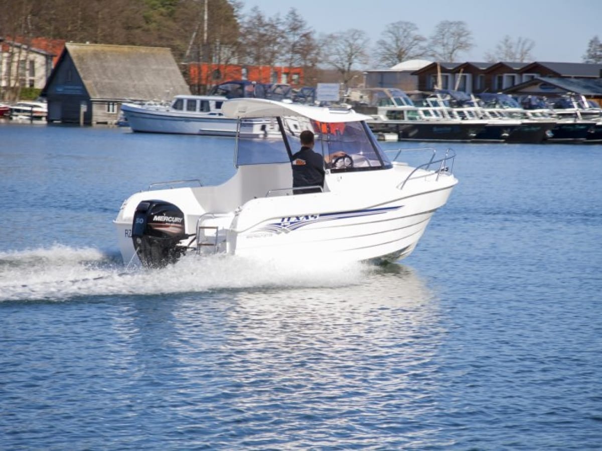 Jacht motorowy dla 4 osób z możliwością noclegu dla 2 osób. Szybki i zwrotny, wyposażony w silnik Yamaha 60 KM. Wygodny podczas całodniowych rejsów na śródlądziu.
